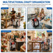 - AMPLE STORAGE FOR CRAFT SUPPLIES: This craft storage organizer features 2 row wrapping paper holder, can hold 14 rolls wrapping paper; and provides 3 spool in the middle, which can store ribbons, strings, tapes and hemp ropes, and more. The craft organizer holder provides 18 hooks and holes for hanging tools such as scissors, embroidery threads, packaging bags, and gift bags.