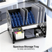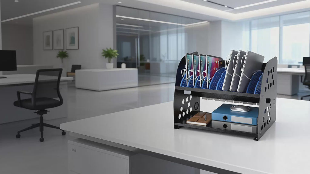 - Smart Cable Management + Extra Storage Space: This tablet charging rack eliminates tangled cords with built-in cable clips on the back. The lower storage tray handily stores chargers, cables, school supplies or accessories, ensuring quick access.